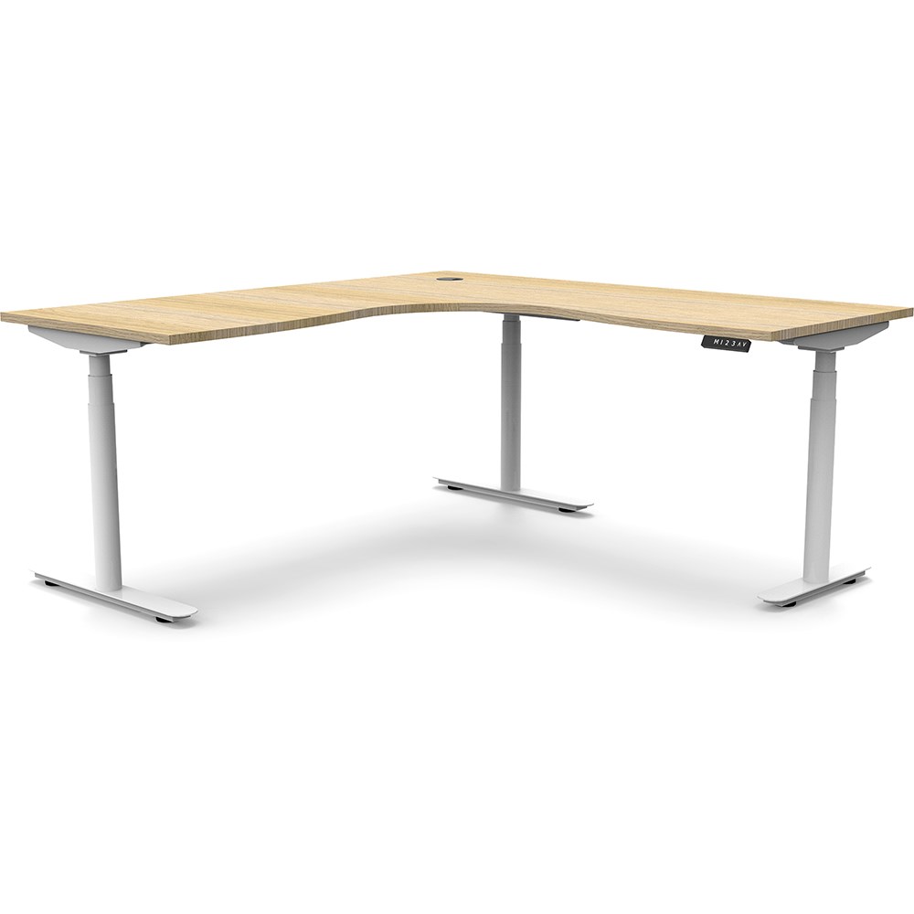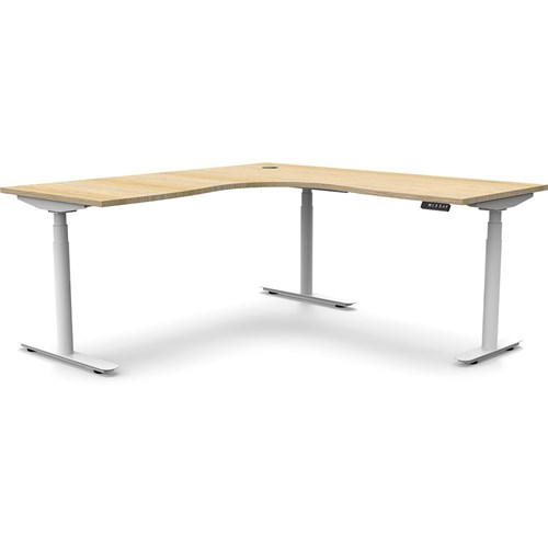 Natural Oak top with White frame. Unit Dimension: 1800/1800mm W x 750mm D x 620-1270mm H. E0 rated top. Powdercoat base. Digital control panel with 3 pre-set positions, LED display panel, keypad safety lock & reminder alarm setting. Anti-collision technology, noise emission of less than 50DB. Lifting capacity of 120kg with a max speed of 38mm per second. 70mm diameter round column legs. 700mm wide foot size with adjustable leveling feet, return foot: 700mm. 10 Year Manufacturer's Warranty. Delivery, installation and assembly charges may apply to furniture. Please enquire to confirm.
