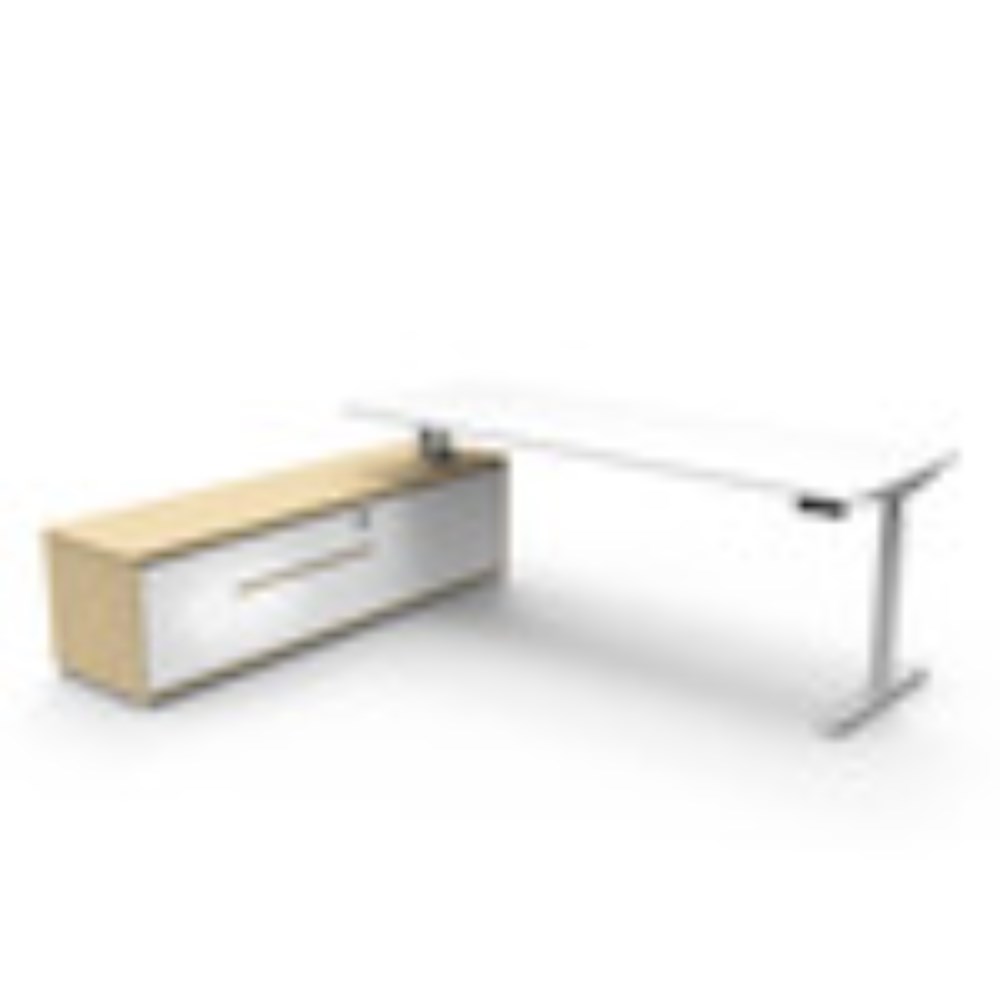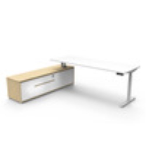 • Natural White top and White Satin frame. Height adjustable desk with left hand side cabinet.