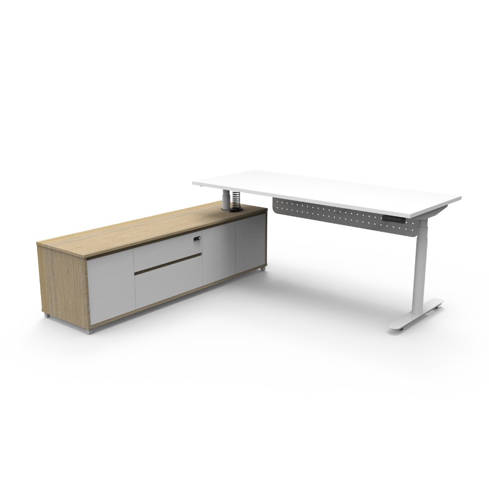 • Natural White top and White Satin frame. Height adjustable desk with modesty panel and left hand side cabinet.