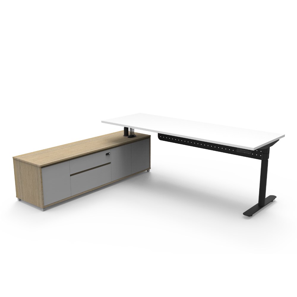 • Natural White top and Black Satin frame. Height adjustable desk with modesty panel and left hand side cabinet.