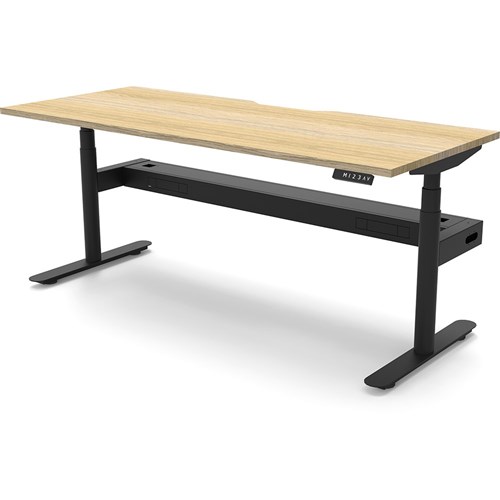 Natural Oak top with Black frame. Unit Dimension: 1500mm W x 750mm D x 620-1270mm H. Comes with cable tray for cable management. E0 rated top. Powdercoat base. Digital control panel with 3 pre-set positions, LED display panel, keypad safety lock & reminder alarm setting. Anti-collision technology, noise emission of less than 50DB. Lifting capacity of 120kg with a max speed of 38mm per second. 70mm diameter round column legs. 700mm wide foot size with adjustable leveling feet, return foot: 700mm. Comes with cable tray for cable management. 10 Year Manufacturer's Warranty. Delivery, installation and assembly charges may apply to furniture. Please enquire to confirm.
