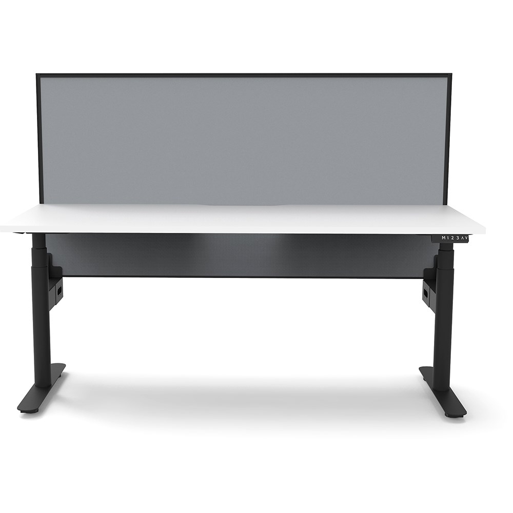 White top with Black frame. Unit Dimension: 1200mm W x 750mm D x 1330mm H. 620-1270mm height range for desk. E0 rated top. Powdercoat base. Digital control panel with 3 pre-set positions, LED display panel, keypad safety lock & reminder alarm setting. Anti-collision technology, noise emission of less than 50DB. Lifting capacity of 120kg with a max speed of 38mm per second. 70mm diameter round column legs. 700mm wide foot size with adjustable leveling feet, return foot: 700mm. Comes with 30mm thick privacy screen. 10 Year Manufacturer's Warranty. Delivery, installation and assembly charges may apply to furniture. Please enquire to confirm.