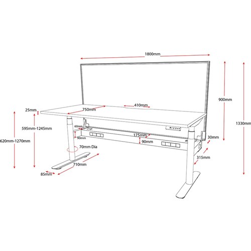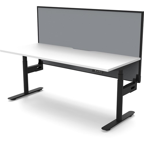 White top with Black frame. Unit Dimension: 1800mm W x 750mm D x 1330mm H. 620-1270mm height range for desk. E0 rated top. Powdercoat base. Digital control panel with 3 pre-set positions, LED display panel, keypad safety lock & reminder alarm setting. Anti-collision technology, noise emission of less than 50DB. Lifting capacity of 120kg with a max speed of 38mm per second. 70mm diameter round column legs. 700mm wide foot size with adjustable leveling feet, return foot: 700mm. Comes with 30mm thick privacy screen. 10 Year Manufacturer's Warranty. Delivery, installation and assembly charges may apply to furniture. Please enquire to confirm.