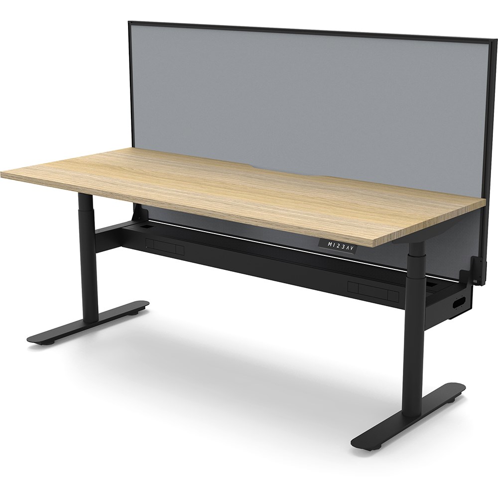 Natural Oak top with Black frame. Unit Dimension: 1800mm W x 750mm D x 1330mm H. 620-1270mm height range for desk. E0 rated top. Powdercoat base. Digital control panel with 3 pre-set positions, LED display panel, keypad safety lock & reminder alarm setting. Anti-collision technology, noise emission of less than 50DB. Lifting capacity of 120kg with a max speed of 38mm per second. 70mm diameter round column legs. 700mm wide foot size with adjustable leveling feet, return foot: 700mm. Comes with 30mm thick privacy screens and cable tray for cable management. 10 Year Manufacturer's Warranty. Delivery, installation and assembly charges may apply to furniture. Please enquire to confirm.