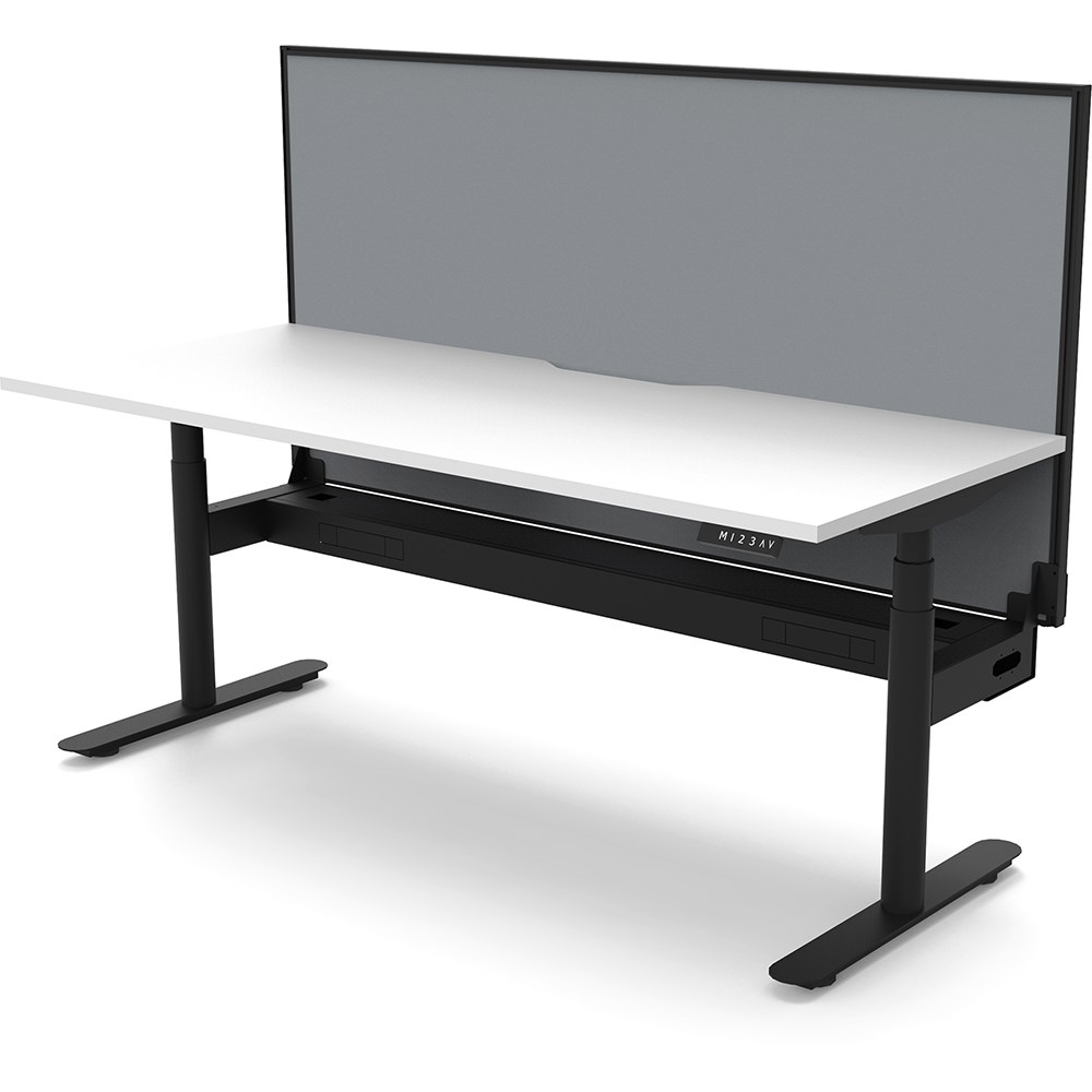 White top with Black frame. Unit Dimension: 1800mm W x 750mm D x 1330mm H. 620-1270mm height range for desk. E0 rated top. Powdercoat base. Digital control panel with 3 pre-set positions, LED display panel, keypad safety lock & reminder alarm setting. Anti-collision technology, noise emission of less than 50DB. Lifting capacity of 120kg with a max speed of 38mm per second. 70mm diameter round column legs. 700mm wide foot size with adjustable leveling feet, return foot: 700mm. Comes with 30mm thick privacy screens and cable tray for cable management. 10 Year Manufacturer's Warranty. Delivery, installation and assembly charges may apply to furniture. Please enquire to confirm.