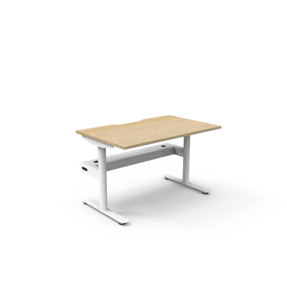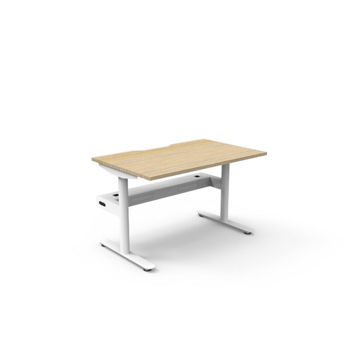 Natural Oak top White Satin frame. Single workstation with cable tray. Dimensions: 1200W x 750D x 730mmH. E0 Rated 25mm top with rigid edging and 50mmD scallop cut out for efficient cable management, while the fully ducted cable tray ensures cords stay organised. Powder coated underframe. Adjustable levelling feet. 10 Year Manufacturer's Warranty. Delivery, installation and assembly charges may apply to furniture. Please enquire to confirm.