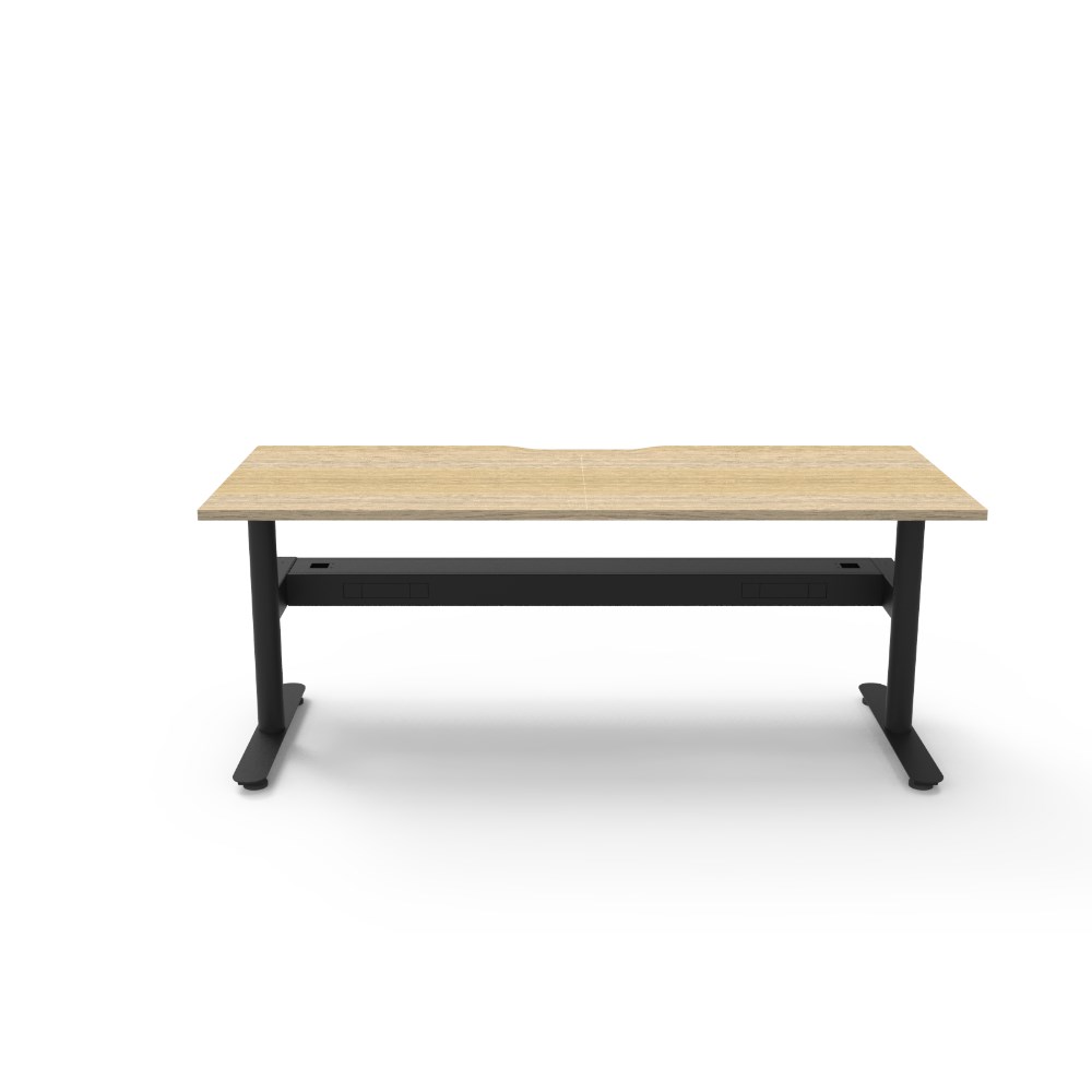 Natural Oak top Black Satin frame. Single workstation with cable tray. Dimensions: 1800W x 750D x 730mmH. E0 Rated 25mm top with rigid edging and 50mmD scallop cut out for efficient cable management, while the fully ducted cable tray ensures cords stay organised. Powder coated underframe. Adjustable levelling feet. 10 Year Manufacturer's Warranty. Delivery, installation and assembly charges may apply to furniture. Please enquire to confirm.