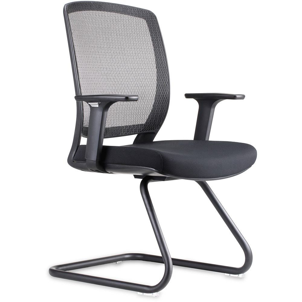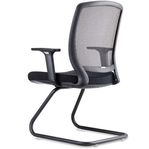 • Mesh back visitor chair with ample seat and back size and adjustable arms, with modern black cantilever base. Ideal visitor chair to go with any mesh back desk chair or use as meeting chair.