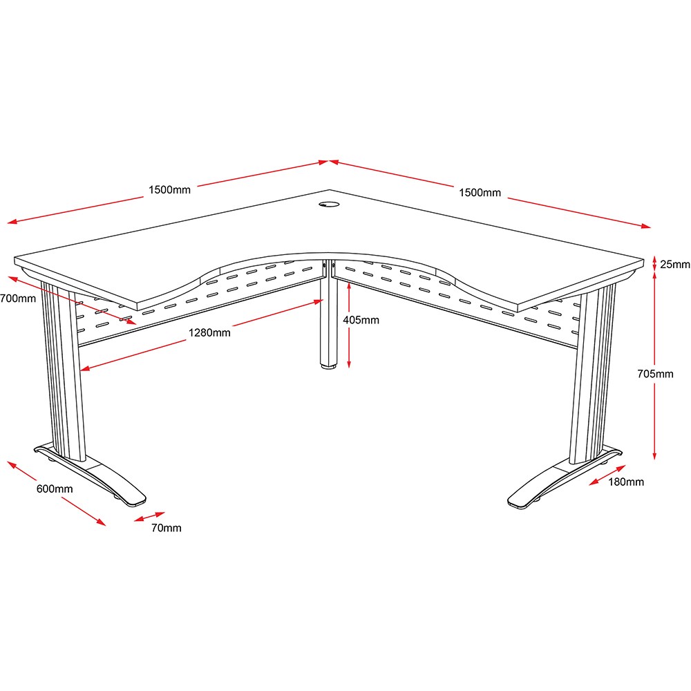 One piece corner workstation with 25mm top. Sturdy powder coated frame and legs. Comes with metal perforated modesty panel and cable tidy. E0 Enviroboard top. 1 x 80mm cable entry hole in corner of top. Adjustable feet. 5 Years Manufacturer's Warranty. Delivery, installation and assembly charges may apply to furniture. Please enquire to confirm.