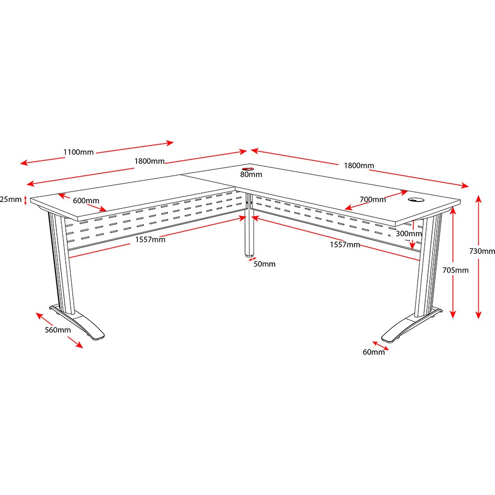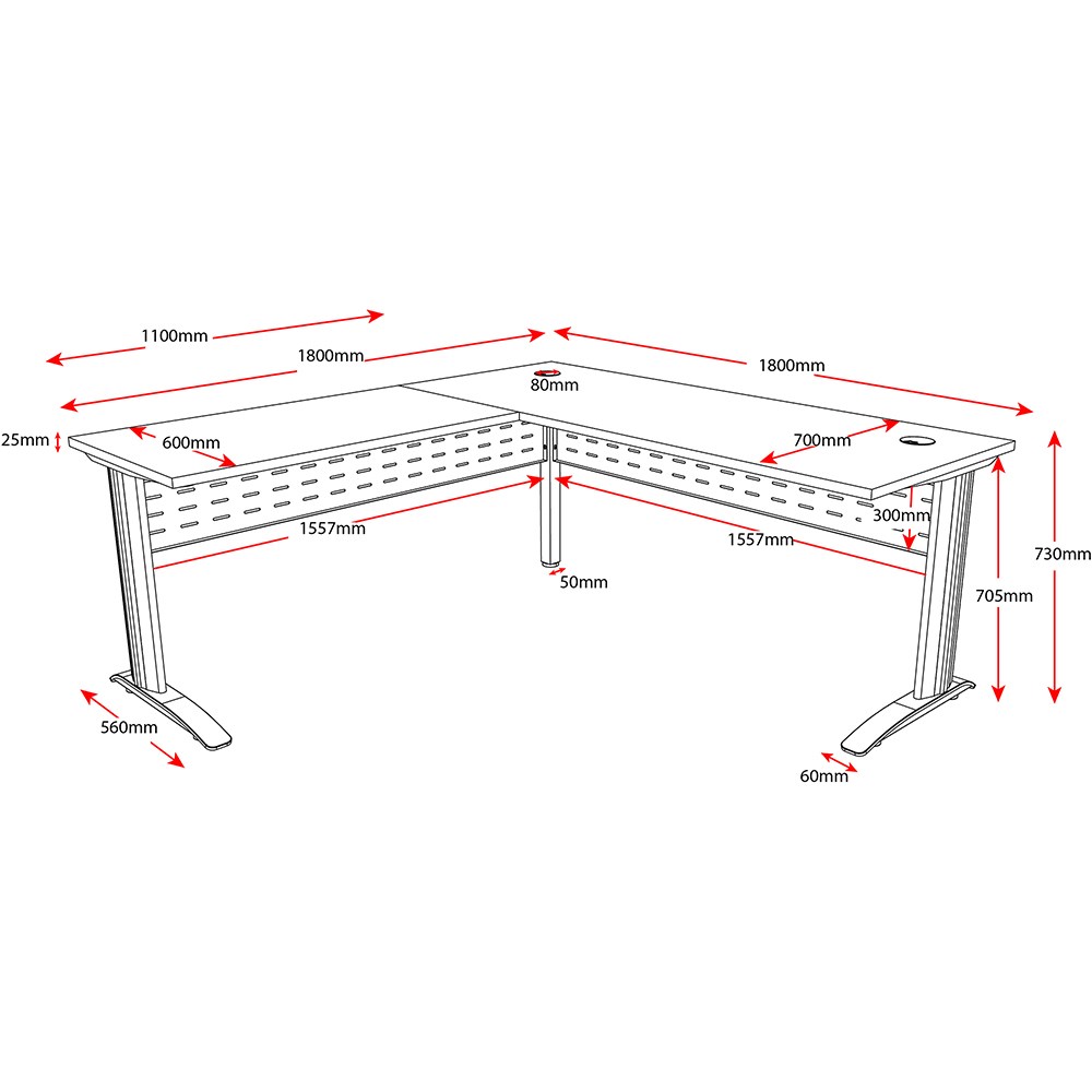 2 Pieces 1800W x 700D x 730mmH. Return 1100W x 600D x 730mmH. E0 enviroboard. Metal powder coated leg. 2 x 80mm diameter cable entry holes. Adjustable feet. Perforated metal modesty panel. 5 Years Manufacturer's Warranty. Delivery, installation and assembly charges may apply to furniture. Please enquire to confirm.