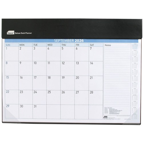 Never forget your appointments with this deluxe desk planner. Keep up to date and in control of your planning. Month to a page desk pad planner with ample writing space and reminder sections. Black leather grained backing with clear PVC corners to keep the sheets in place. Clear plastic slip cover to protect the pages after notes have been made. Full 12-month calendar on each sheet with extra space for notes/memos. FSC Certified.