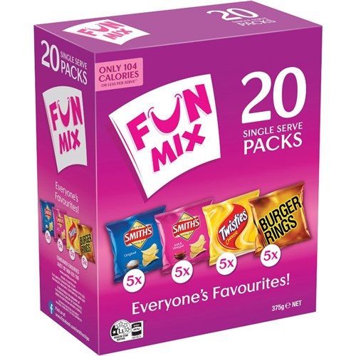 • 5 x Original, 5 x Salt and Vinegar, 5 x Twisties and 5 x Burger Rings.