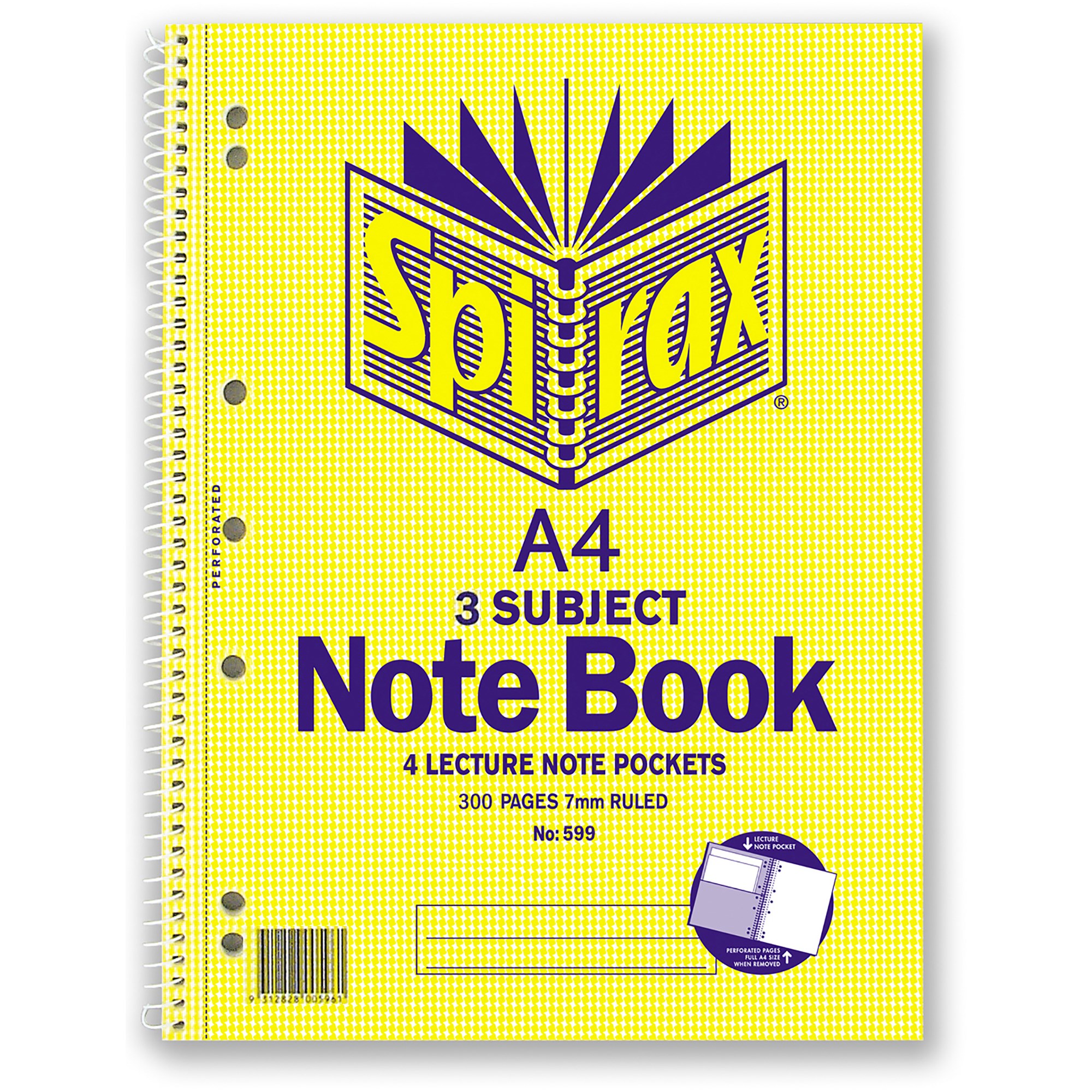 Spirax 599 3 Subject Notebook Perforated/Note Pockets A4 Ruled 300 Page Side Opening