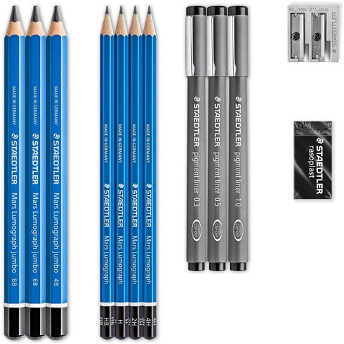 Pack includes the following: Mars Lumograph 100 & Mars Lumograph jumbo 100J to sketch the baselines of the artwork and draw gently light pencils strokes Pigment liner 308 to outline the motive Art eraser 526 B30-9C Double-hole sharpener 510 21 Graphite pencils made of certified wood from sustainably managed forests Hangable cardboard box with window for visibility of products Step-by-step-instructions and detailed descriptions of the applications