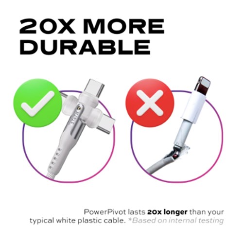 Unique rotating connector stays out of your way. Patented rotating head. Military grade nylon cable. Silicone cable organizer included. Charge light indicator. Additional USB-A adaptor included. Long rubber cable transition lasts up to 20 x longer than typical plastic cables. BlitzCharge 100W with USB-C, 18W with USB-A adaptor. 480mb/s data transfer. 2 Year Manufacturer's Warranty.