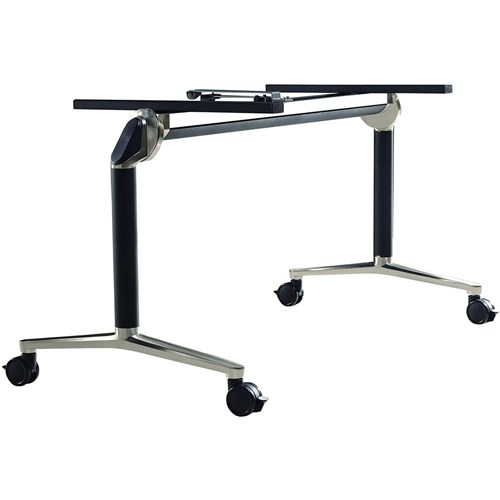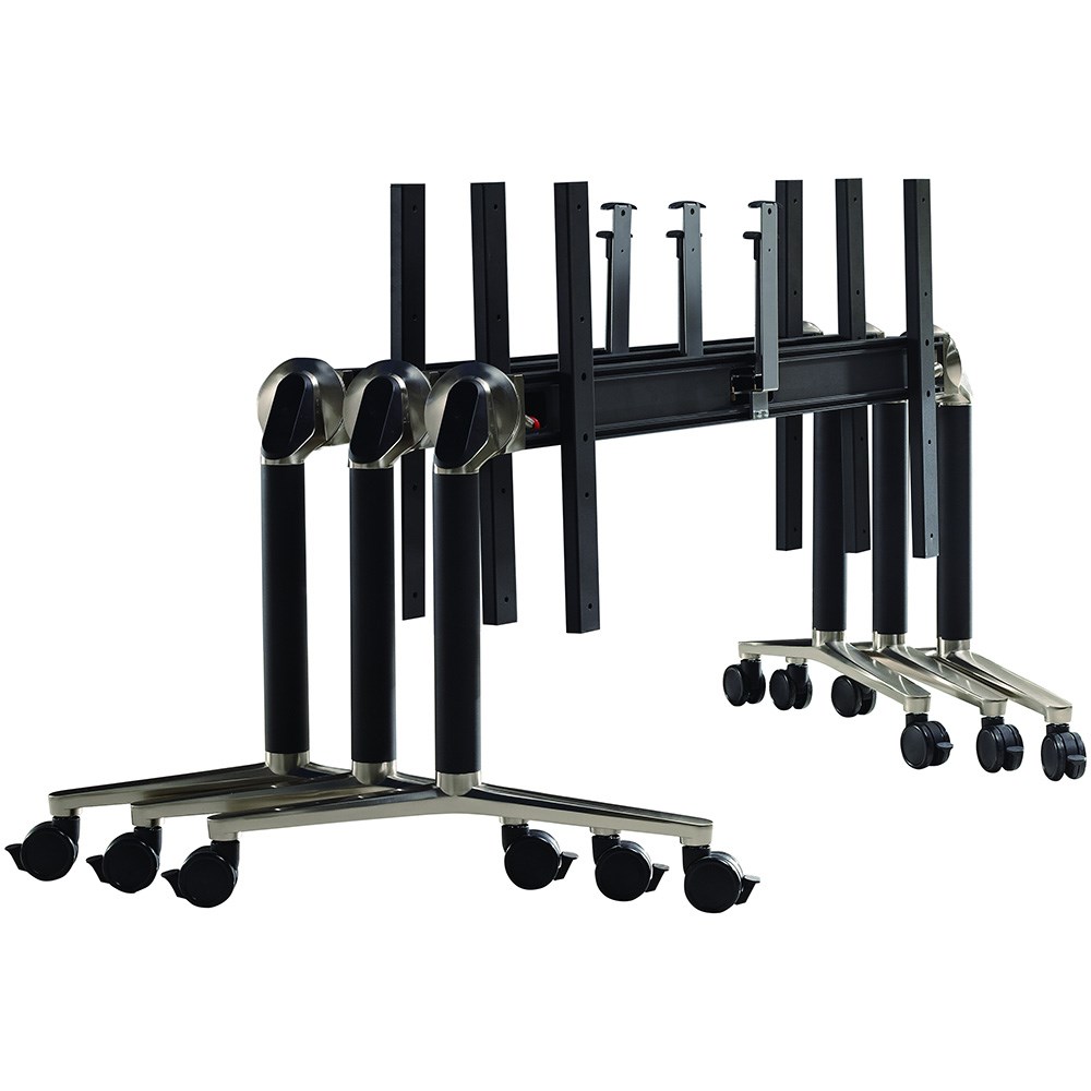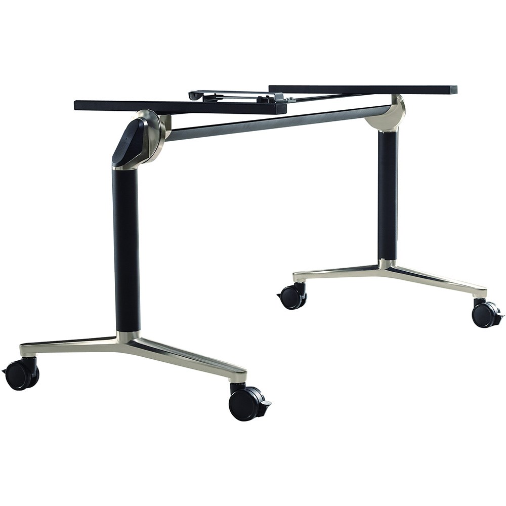 Aluminium flip table base only. Suits a top length 1450-2400mm. Suits a top depth from 660-980mm. Heavy duty lockable castors. As the table top is elevated the legs splay out, reducing depth and allowing the tables to stack straight on for storage, rather than offset on a diagonal. 10 Year Manufacturer's Warranty. Delivery, installation and assembly charges may apply to furniture. Please enquire to confirm.