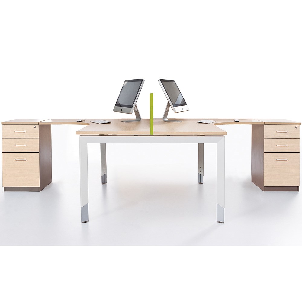 2 Person Corner Workstation Snow Maple top and White frame. Includes 2 x 2 drawer 1 file fixed pedestals. Dimensions: 3000/1500W x 500/600D x 620-920mmH. Convert this collaborative workspace into two private work desks with the addition of divider screens. Height settable legs, this unique design provides ergonomic support by adjusting to you and your colleague's height. 10 Year Manufacturer's Warranty. Delivery, installation and assembly charges may apply to furniture. Please enquire to confirm.