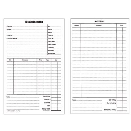 • Designed for electricians, plumbers, contractors etc. Card contains customer's name and details, particulars of the work performed, employee's time spent on the job and the cost.
