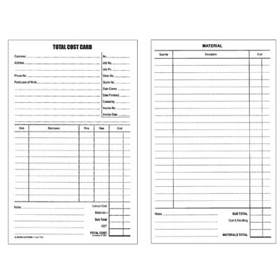 Designed for electricians, plumbers, contractors etc. Card contains customer's name and details, particulars of the work performed, employee's time spent on the job and the cost. On the reverse side there is space for details of the materials used and their cost.