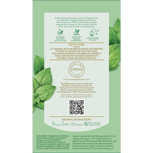 Carefully selected the most aromatic leaves for our Pure Peppermint blend, to deliver a fresh and invigorating experience with every sip. One tea bag serves one cup. Store in a cool dry place.