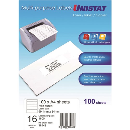 Suitable for laser, inkjet and copiers. Supported by free software at www.unistat.com.au. Size: 99x38mm with margin, 1600 labels, 100 sheets, 16 labels per sheet (16UP).