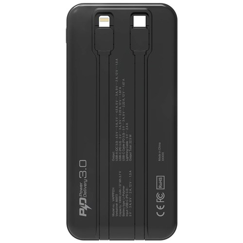 Embedded USB-C and Lightning cables, 1 USB-C port and 1 USB-A port. With 2 cables and 2 ports, it can charge up to 4 devices simultaneously. Fast charging with USB-C port supporting PD 3.0 up to 20W and USB-A supporting QC 3.0 up to 18W. FCC, CE and RoHS certification, supported by global product liability insurance. Over charge voltage protection and over discharge voltage protection. Over current protection, short circuit protection and over temperature protection.