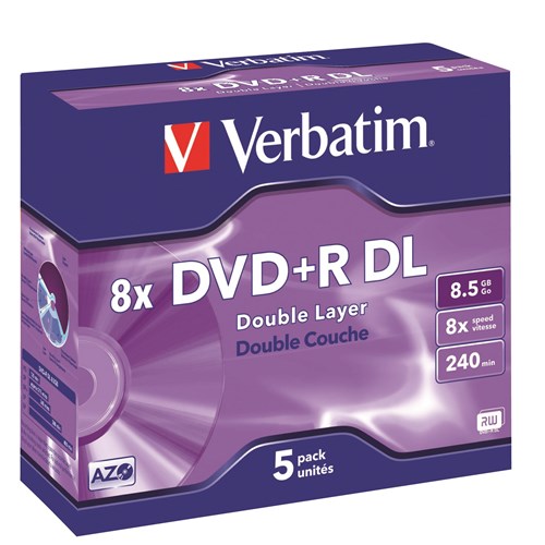 Verbatim Recordable DVD+R 240Min 8.5GB 8X Double Layer Jewel Case Pack Of 5