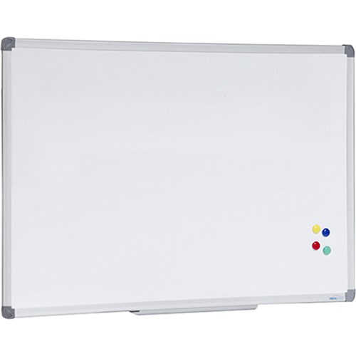 Excellent hardwearing magnetic surface for general use applications. For use with dry wipe pens. Can be mounted landscape or portrait. Aluminium frame, concealed corner mounting supplied with pen tray and fixings. Surface guaranteed for 8 years. 4 free coloured magnets with every board. Ideal for all lighter to medium whiteboard writing users.