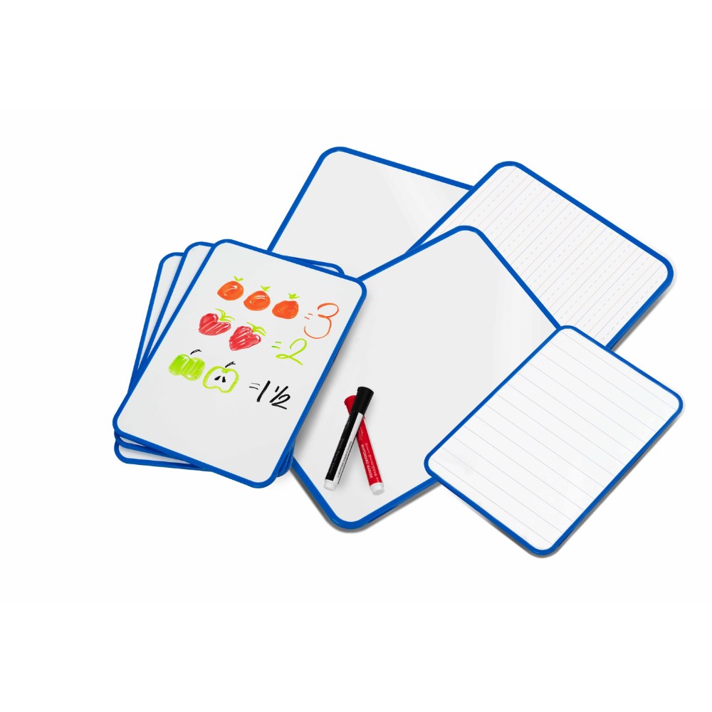 Double sided, Plain both sides. Lightweight magnetic whiteboards ideal for agile education. Great for collaborative group and individual focused learning. Add the optional Magnetic eraser/marker to make a complete individual student whiteboard solution, please see product 3039136. Size: 297W x 210mmH. Sturdy navy blue moulded frame. Save paper and allow students to practice skills. Use any whiteboard markers, wipes clean easily.
