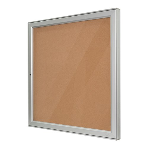 Silver frame with cork internal. The ideal information display case for outdoor areas. Water resistant design with internal rubber seal. Single lock with 2 keys provided. No visible hinges - internal pivoting design. Perspex window with aluminium frame, 50mm depth from wall. Back board in Bulletin board cork. For added integrity the back of each case is laminated. Magnetic whiteboard surface can also be supplied for additional cost.