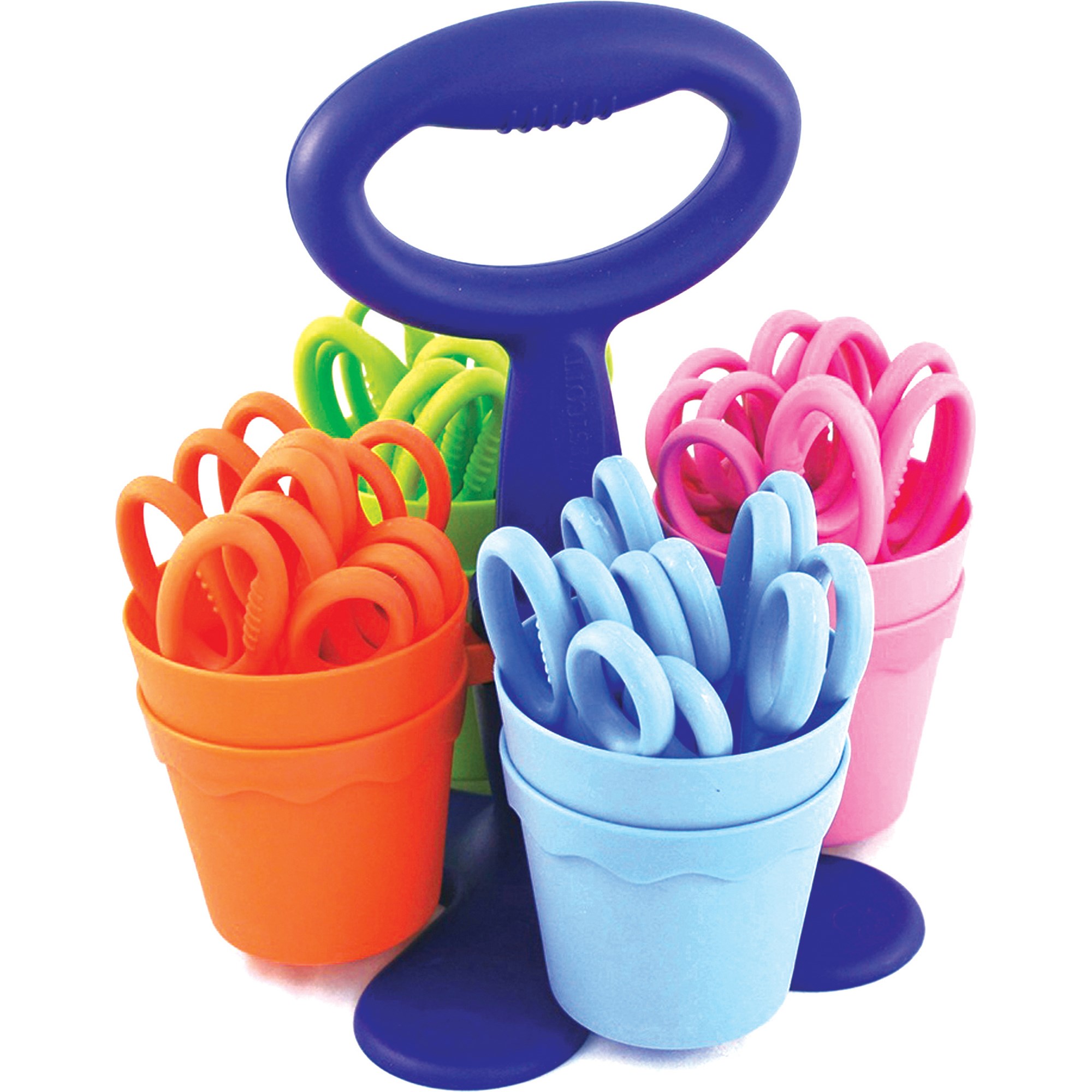 Ideal for the classroom. Comes stocked with 24 x blunt 127mm kids scissors that both right and left handed kids can use. Caddy features a carry handle, sturdy non skid base and four colorful removable cups for easy storage and handling. Cups also rotate for easy access. Features antimicrobial protection. Most suited for ages 4+. Available in four assorted colours.